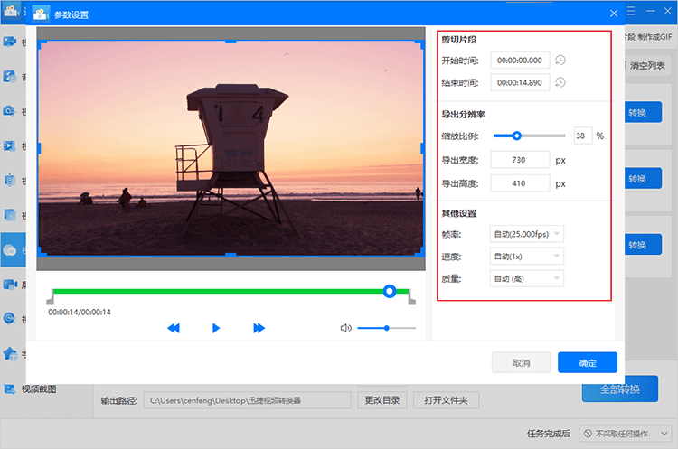 Einzelne Datei: Klicken Sie auf die "Parametereinstellungen" der Videodatei, ändern Sie die Zeit, die das Video geschnitten wurde, die Größe des geschnittenen Bildschirms und stellen Sie die Parameter wie Auflösung, Bildrate und andere fest. Klicken Sie auf "OK", um den Vorgang zu speichern.